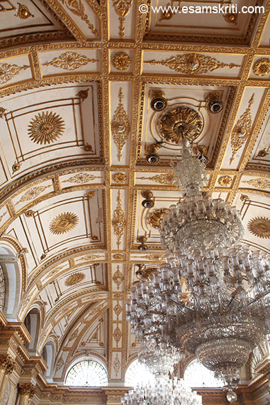14. Durbar Hall – see two huge Belgian chandeliers each of which is 3,500 kgs 250 bulbs. These were purchased in Paris & assembled here. Post-independence this Durbar Hall became a drawing room.