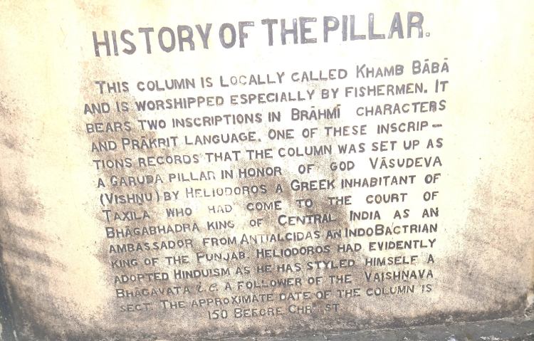 found here is a large stone pillar with an inscription, dated between 120–100 BCE. It was set up by a Greek devotee named Heliodorus, in honour of Vasudeva, another name of Lord Vishnu.”