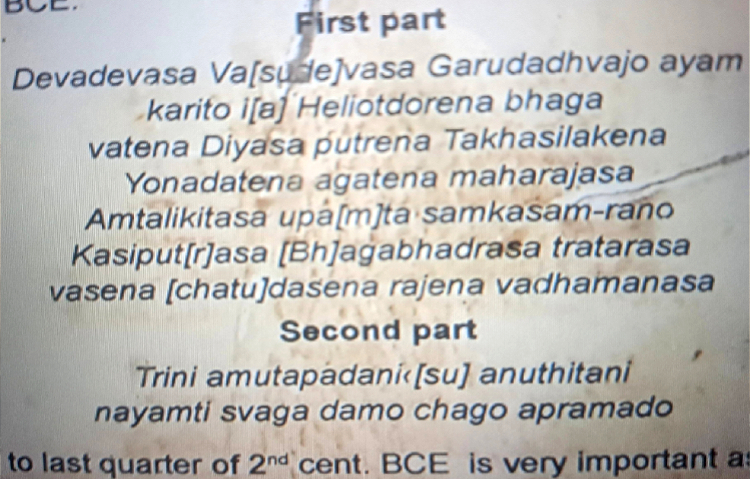 कारितो इअ हेलिओदोरेना भगवातेना दियासा पुत्रेना तकखसिलाकेना योनदातेना आगतेना महाराजसा अमतालिखितसा उपं[त] संकासम-रानो कासीपुत्रसा भगभद्रसा त्रातारसा वसेना चतुदसेना राजेन वधमानसा