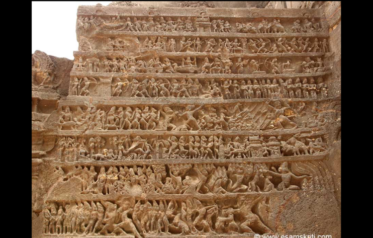 Entire Ramayana on wall of Kailasa Temple, Ellora.