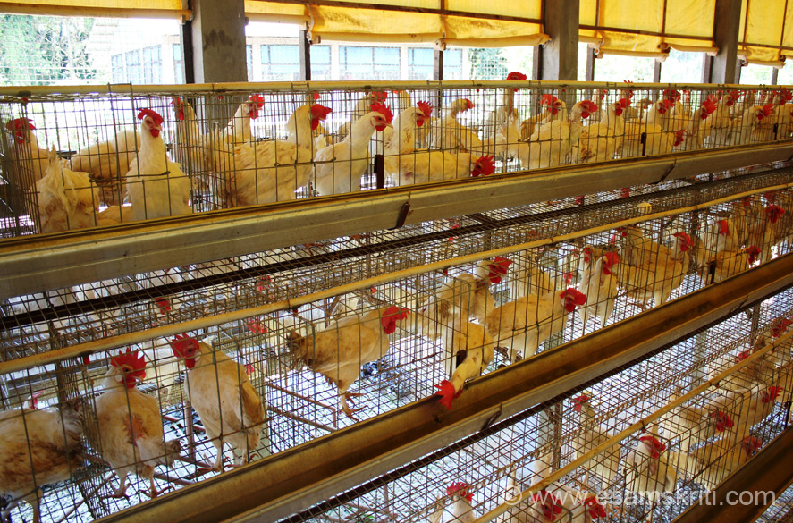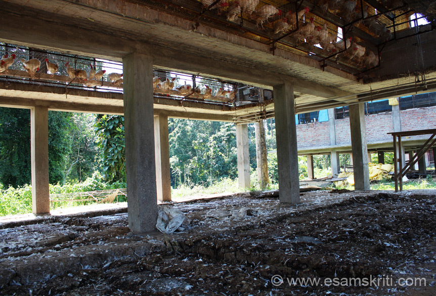 Above is where the hens are kept. Droppings of the hen fall on the ground that u see. It is collected and then used as a fertilizer in agricultural farm.