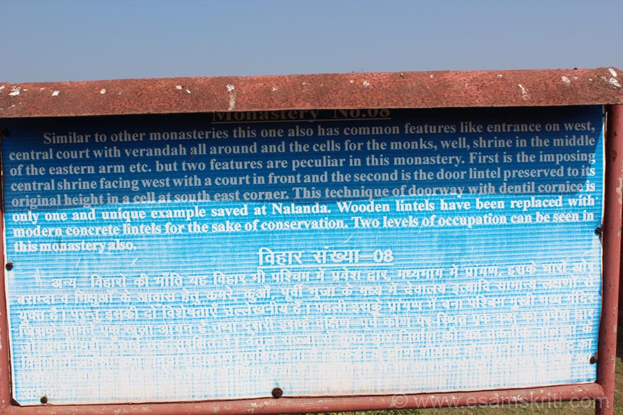 Board outside monastery 1. I have shown the next few pics as monastery 1. Hope it is that and not monastery 1A, 1B. We learn from Hiuen Tsang that the course studies comprised of not only the works