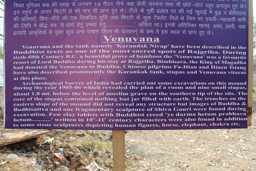 2. Board outside Venuvana. Hills and caves surrounding Rajgir were home to many spiritual teachers ranging from the materialism of the early Charavaka School to the metaphysics of Upanishadic