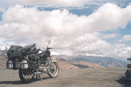 On the way to Barlacha Pass. The terrain is rough; the road is non existent at places, perfect for biking. I used an Enfield 500 (named Kali) and Emily used an Enfield 350 (named Gypsy Rani).