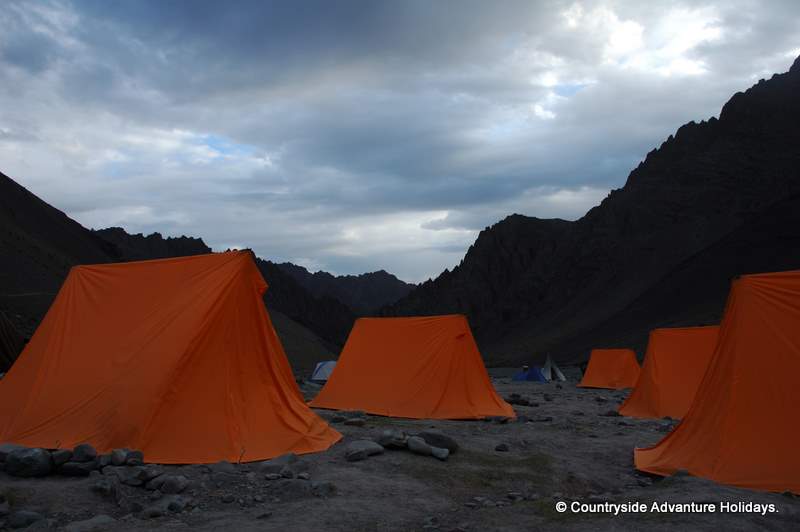 A view of the base camp at sunset. After sunset there is a quick and sudden drop in temperature.