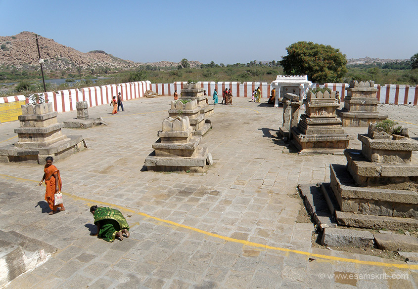 U are on the banks of the holy Tungabhadra river. The hill u see straight in front of your pic is Anjanadri Hill birth place of Hanuman. The white structure is temple on top of hill. On the left of pic is the sacred Rishya-mukha hill. I missed clicking the 108 and 1008 linga that are there in a square area. If u have pic please mail me.