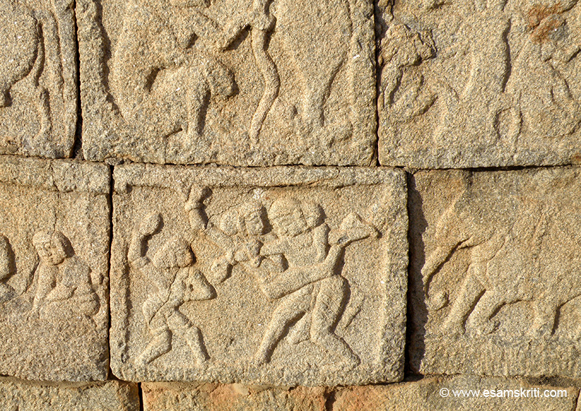 with courtly scenes, festive moods, hunting scenes and rows of animans and birds carbed in relief around the platform, representing the life and times of the people of Vijaynagara.