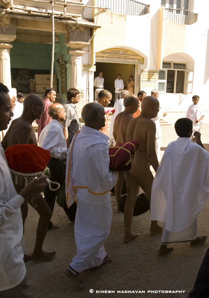Shravanabelagola is the seat of the ancient Bhattaraka Matha, belonging to the Desiya Gana lineage of the Mula Sangh, of the Digambara Jain monastic tradition. The Bhattarakas of this Matha are all named Carukirti. In this picture, you see three Digambara Sadhus.
