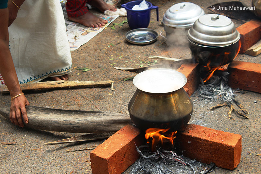 23. Cooking ponkala in progress. Placed 3-4 bricks & kept dish on that. Now wait for auspicious moment. The devotee offering to the Devi is done, usually by about 3 pm. The open hearth is made of 3 freshly baked kiln bricks, usually 3 or 4 placed in a manner such that it can hold an earthen pot which will be used to make the payasam. The lit fronds fire the hearth & cooking starts at an auspicious time when temple fire is lit by the priest.