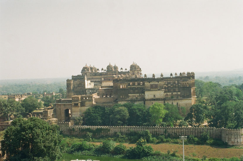 A view of the Raja Mahal complex clicked from Chathurbuj Temple. A four arched bridge leads to the fort complex on the island. The complex has a 14 kms fort wall around it. It consists of Raj Mahal, Jehangir Mahal, Rai Parveen Mahal. A must see.