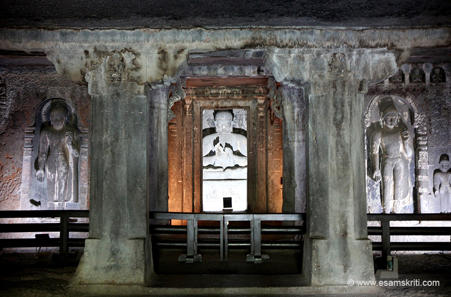 23. Cave 7. This monastery does not have a hall but 2 small porticos, each supported in front by 2 octagonal pillars. U see seated Buddha with an elliptical halo carved on the back wall. On either side of door panel are seated images of Buddha.