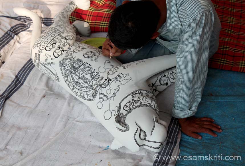 What you see is made of paper mesh, painting requires lots of patience as I saw in the village. Artist is Apindra Swain, village Raghurajpur, near Puri Odisha, 91 99386 20662.