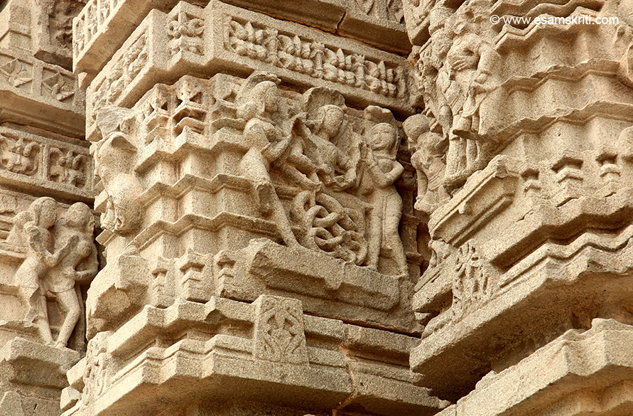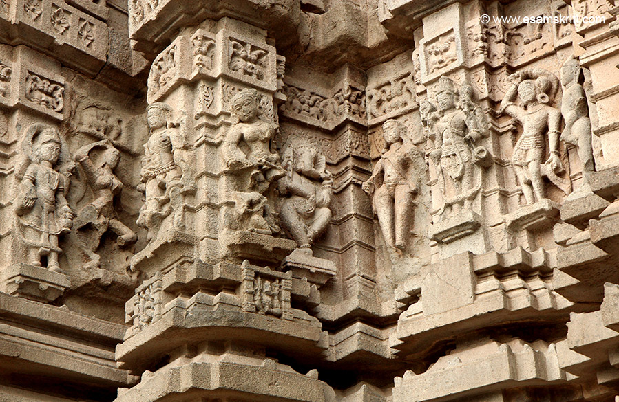 23. North side view end to end. The temple measures 105 feet long by 84.5 feet wide. It is a 3 tier temple. First block is sanctum or Garbha Gruha. In Swarag Mandapa in 4 corners are flying Gandharva couples & upper layer of dancing Apsaras. The third is Sabha Graha or meeting hall.