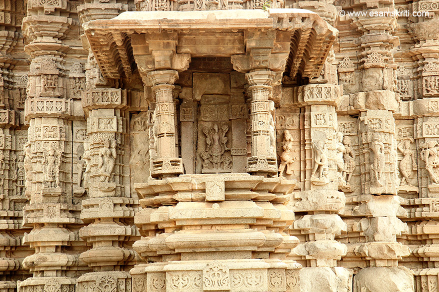 11. Temple is 3 tier. Garbha Graha (sanctum) at end i.e. left of pic, Prayer & dance hall that you see and Sabha Graha (meeting hall). In the niche is Chamunda Devi. There are 3 niches. Other two are Surya Devata and Narasimha Avatar killing Hiranyakashyap. The building never seems to have been finished, roof and 3 doorways to hall are incomplete.