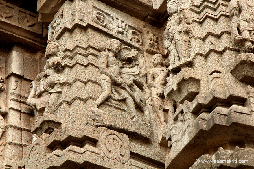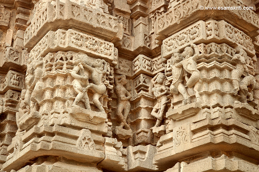 12. Inside niche is Chamunda Devi. Left of murthi is a stylish lady. Panel has sculptures of mithuna couples. The temple measures 105 feet long by 84.5 feet wide. Temple made of black stone profusely carved exterior with images & other ornament.