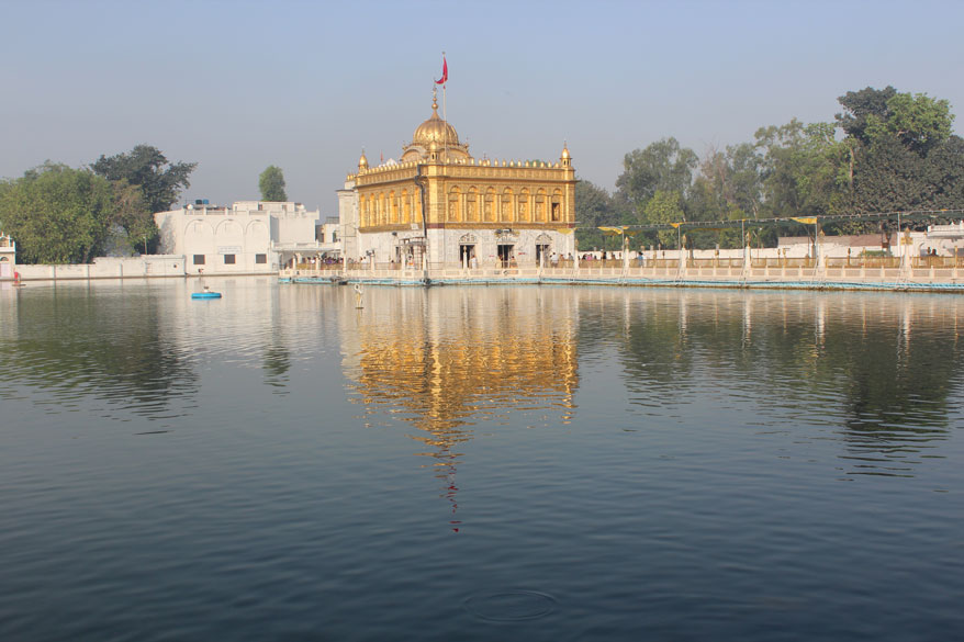 A view of the temple from other side, note temple reflection in water. The temple is situated outside Lohgarh Gate.
