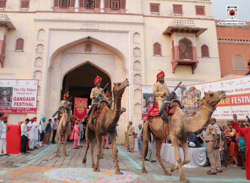 7. Procession of camels coming out of City Palace. Matter in inverted commas is from Rajasthan Tourism site https://www.tourism.rajasthan.gov.in/fairs-and-festivals/gangaur-festival.html