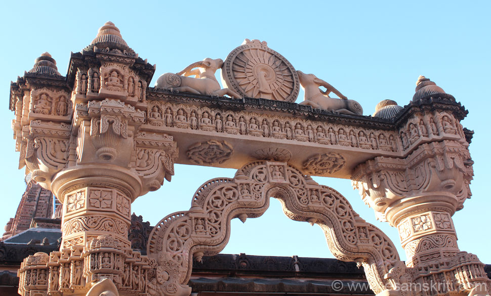 Top part of toran with deers in the centre. Temple is on a raised platform (say 6-9 inches). Centre part of pic at lower level is the temple sanctum. Spend a few minutes to observe the