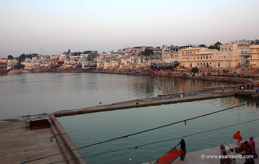View of ghats from west side. Island in pic was built in 1791 by thakur of Khimsar to commemorate Brahma`s yagna spot. Am aware that photography of female bathers is not permitted so taken care to share general