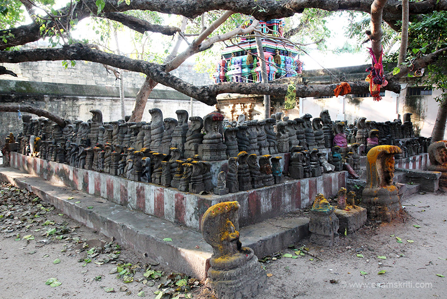 Around temple images of snake gods. "And hence those who are childless, worship at this temple by offering sweet pudding to Lord Adi Jagannatha.