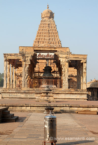 View as we entered temple. Nandi mandapa in front behind is temple. The names of the sthapathi (architect) of this temple are Viracholan kunjaramallan alais Raja Rajan Perundachchan,