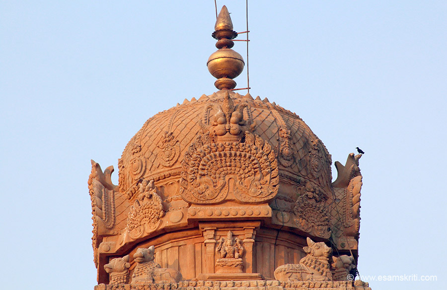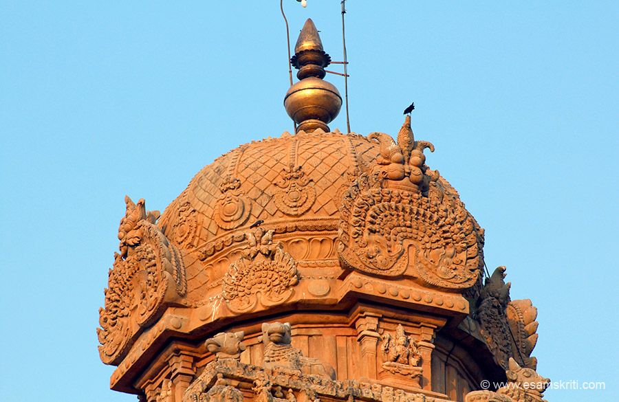 Sikhara has 8 members and weighs 81.284 tons. Note kirti mukhas in centre on each side to ward off evil spirits. This is the 13 tala, the lower 12 talas being in receding dimension whilst this