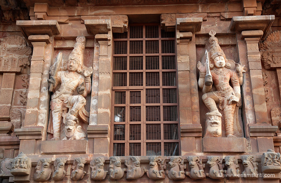 Lower panel right of dvarapalas are these 2 images. Left of pic is Nataraja, right is Kalantaka (form of Shiva that decides our fate). Lower level are imaginary creatures Yazhi.