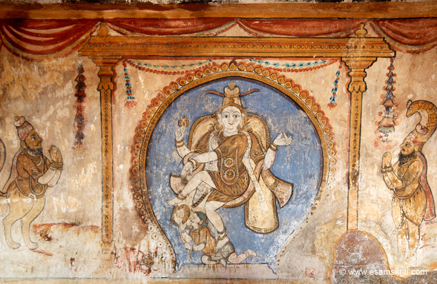 Cloister Mandapa ie all around the temple. This is north side. Mural paintings are there on the northern and western side of the mandapa. We show some. The manadapa was constructed