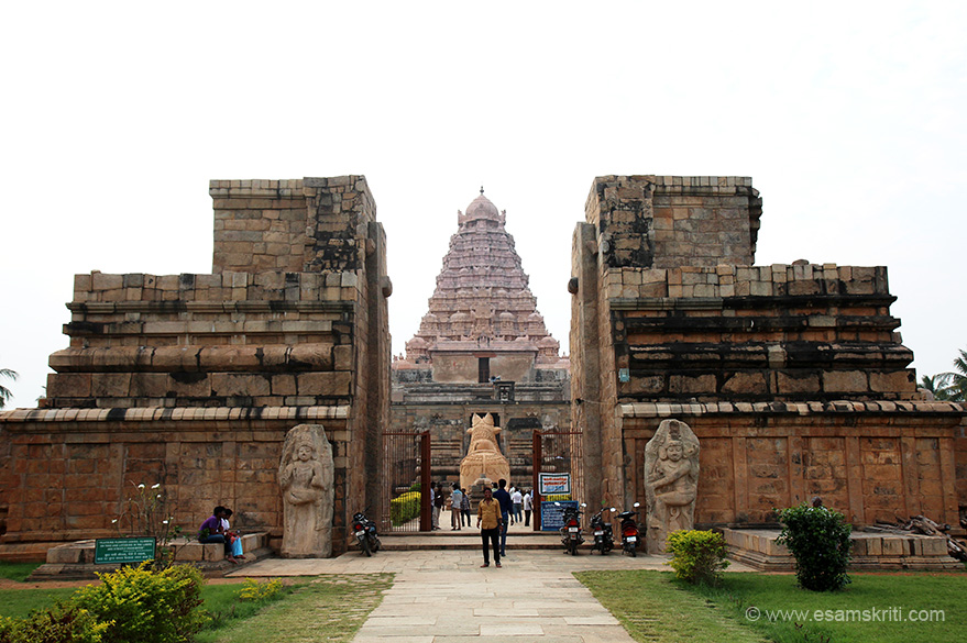 Temple built by Rajendra Chola the Great in 1025 a.d. after his victorious march to river Ganga in North India. Has height of 182 feet and is often described as the feminine counterpart of the Tanjore temple. It is an engineering marvel as the shadow of the main granite tower (Srivimana) never falls on the ground throughout the year. The victorious Chola armies brought back water from the Ganges in golden vessels to consecrate the new found land.