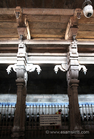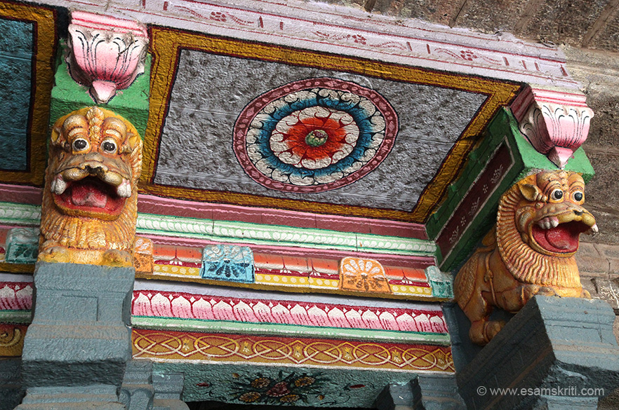Mythical animal Yali adorn the pillars. Ornamental metal image of a lady Pavai Nonbu holding a lamp is still present in the temple. The base of the lamp has an inscription indicating the