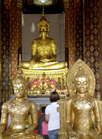 You see an image of Buddha in the hall. Thais afix a thin gold strip paper on the smaller Buddhas as you can see in this picture. You can reach Ayutthaya by train or boat from Bangkok. Am told the boat journey is very good.