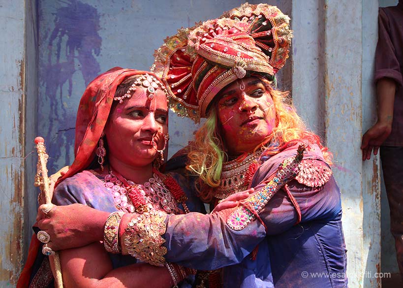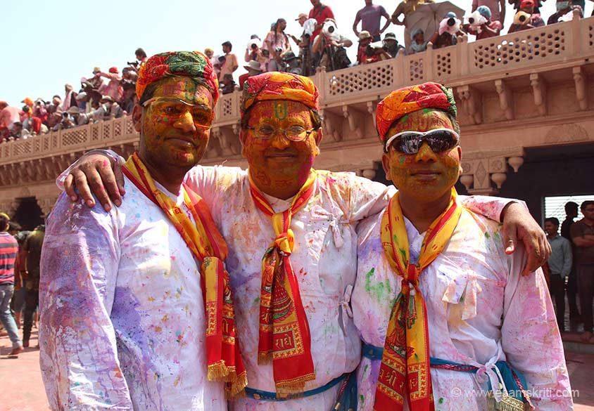 Day 1 is Laddoo Holi at Barsana, day 2 is Lathmar Holi at Barsana, day 3 is Lathmar Holi at Nandgaon that you see. The two villages are only 7 kms away but celebrations have a different feel to it. Women of Barsana beat men of Nandgaon on day 2. Next day it is the reverse, women of Nandgaon beat men of Barsana with sticks.