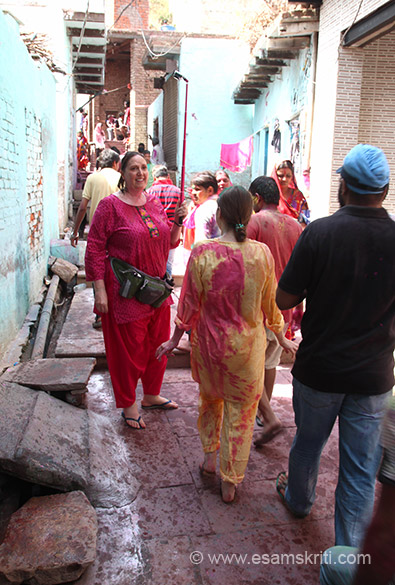 This pic gives u an overview of the area where Lathmar Holi takes place. Left of pic on first floor were a number of Japanese tourists. Other tourists were mostly European. Met Indians from