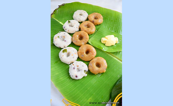 nombu adais cooked with white kidney beans (cow-gram or ‘lobiya’), grated coconut and jaggery. A savoury version is also prepared with the same ingredients replacing jaggery with green chillies and salt. These rice cakes are steamed and served along with blobs of unheated and unsalted butter. The puja offering also includes traditional vettalai-paaku (betel leaves with areca nuts), flowers, coconuts, bananas along with haldi-kumkum.