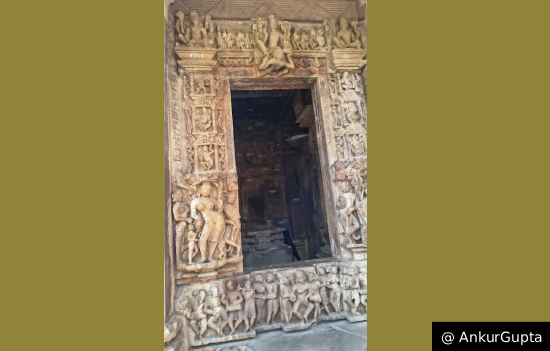 carved doorway leading into a temple sanctum, showing the dense layers of