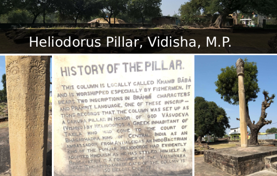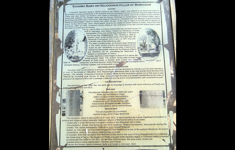 found here is a large stone pillar with an inscription, dated between 120–100 BCE. It was set up by a Greek devotee named Heliodorus, in honour of Vasudeva, another name of Lord Vishnu.”