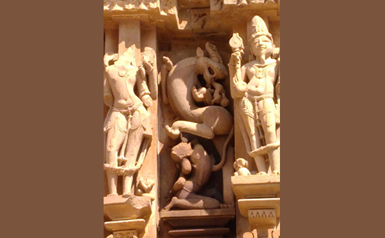 In the Kandariya Mahadeva temple, there are 26 images of Hindu Gods and Goddesses placed in the inner sanctum known as ‘Mahamandapa’ namely seated and standing Uma Maheshvara, Shiva Parvati, eight-armed Brahma, Vishnu, Narasimha, Ardhanarishvara, Shiva, Bhairva, Devi with the lion mount, Indra, Sadashiva to name a few. The darker recesses of the wall surface area inhabited by protective creatures, Vyala, mythical being fighting the forces of evil and Nag kanyas folding their hands in prayer and blessings posture.