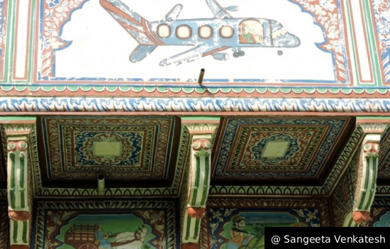 Perhaps the most surprising phase came when Shekhawati’s traders, travelling across the world, discovered new inventions. Their excitement found its way onto the walls: Trains, Early automobiles, Bicycles, Hot air balloons, Telegraph lines and Europeans in Victorian clothing
