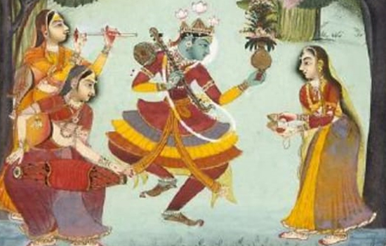 and Tumburu (grandson of Brahma) play music to entertain the king.