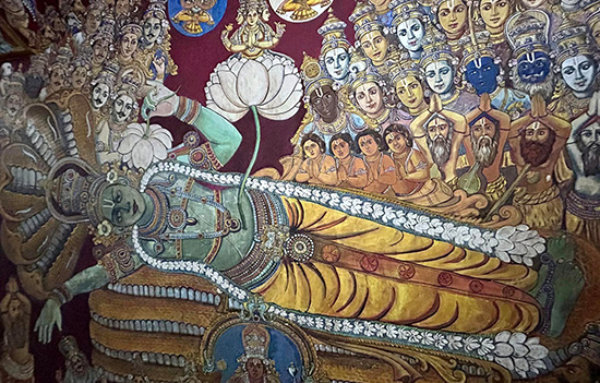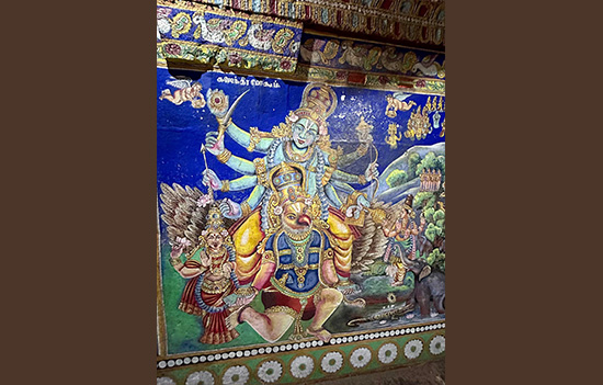 There is a stunning painting of Bhikshatanar Shiva outside the main entrance of the inner hall. There are paintings of Srichakra, Lord Shiva as Nataraja, the entire story of Lord Sundareshwara and Meenakshi’s wedding, Shri Vishnu as Ananthashayanam, Ashta Durgas, Ashta Bhiravas, 16 forms of Ganesha, Bala Murugan and many more. The paintings are most likely a Chera legacy, because they carry a strong influence of the Kerala murals.