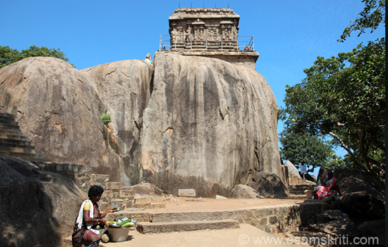 The most famous example of Pallava architecture is of course, the monuments at Mamallapuram, a seaport town at the mouth of the Palar River, 56 km south of Chennai. Some historians opine that Narasimhavarman Pallava, the man behind this wonderful set of temples, poured the treasure he had seized from Vatapi during his conflict with the Chalukyas, into this ambitious construction project and was named after him Mahamallapuram, City of the Great Wrestler. It was built on the shore to probably connect the Pallava court directly to the Indian Ocean trade. The talented Pallava sculptors created this architectural marvel on a large granite hill, 100 feet high, half mile in length from north to south and a quarter of a mile wide, and a smaller granite outcrop further south.