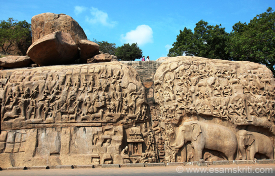 The Descent of Ganga or Arjunas Penance is virtually a classical poem in stone. There are two interpretationsone that it represents the story of Sage Bhagirath who prayed to Shiva that the heavenly Ganga be allowed to descend on his densely matted hair and come to the Earth. Another interpretation is that the saint was Arjuna receiving from Lord Shiva the mighty weapon known as Pashupata. Arjuna was a famed archer, while Narasimhavarman Pallava was a wrestler—the mahamalla. The sculpture can thus also be read as a eulogy to the Pallava king, a declaration that, he, like Arjuna had earned the blessings of Lord Shiva.