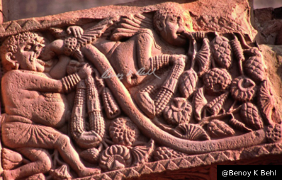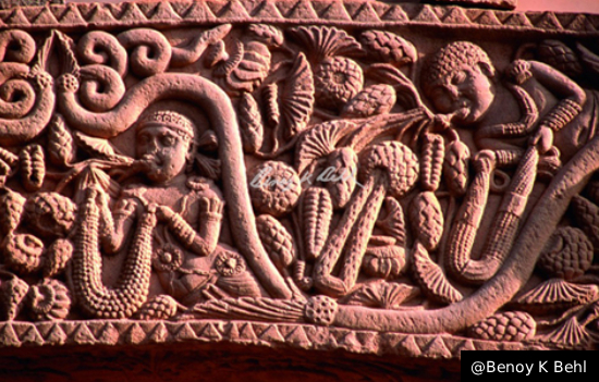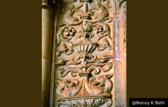It is amazing to see the representation of the ‘vases of plenty’, the vyalas and the continuous vine of life, carrying in it numerous creatures, joyously presenting the world of nature, in the carvings around the doorway. These are exactly the themes made at the doorway of ancient Indian stupas.