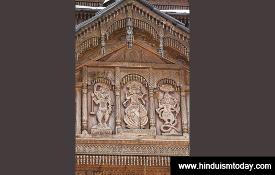 in front of the temple is equally embellished with woodwork. Altogether, over