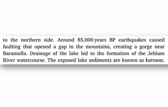 The valley of Kashmir, surrounded by Himalayan Mountain peaks was once a massive lake. Scientists have discovered ‘Karewa’, the local name of flat elevated land, show soil deposits of lakebed and glacial feed. Also, the direction of Karewas slope is in particular direction denoting the flow of water. It is worthwhile to note that land in the valley has a lot of water content and it is very fertile owing to the fact that it was once a lakebed.