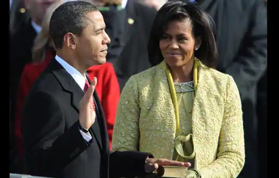 Former U.S. President Obama takes oath with one hand on the Holy Bible.