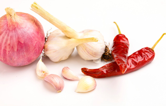 garlic, onions and excessively fried or burnt spices are generally avoided