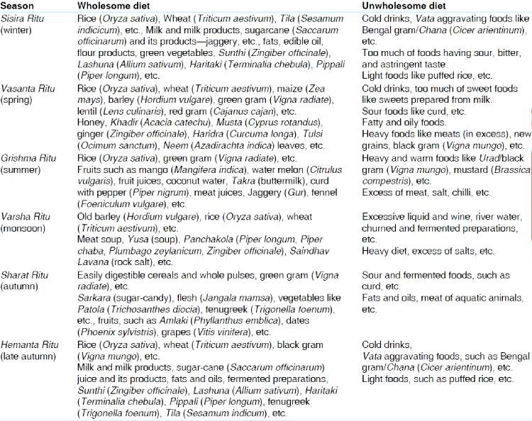 This is the way the ancient sages set up the regimen for various seasons on analytical reasoning to obtain Swastha (health) and prevent the diseases. The examples set by them stand as a hint to decide other dos’ and don’ts’ in the regimen-—Ritucharya [Table 1].
